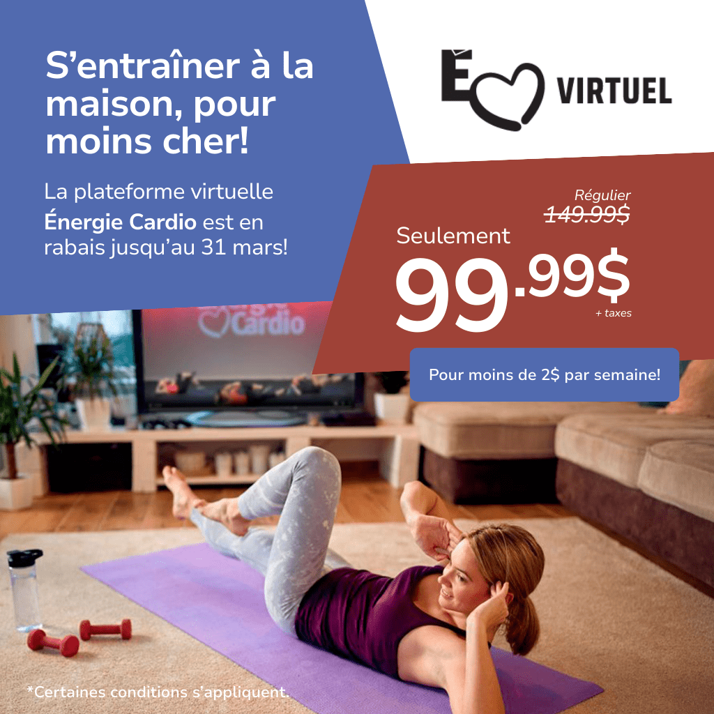 Peu importe ton horaire, ton niveau ou ton humeur, Énergie Cardio Virtuel te permet de profiter de tes cours en groupe et de tes entraînements préférés dans le confort et la commodité.